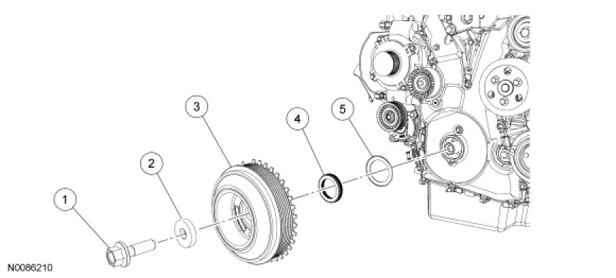 1. NOTICE: Do not loosen or remove the crankshaft pulley bolt without first installing the special tools as instructed in this procedure. The crankshaft pulley and the crankshaft timing sprocket are not keyed to the crankshaft. The crankshaft, the crankshaft sprocket and the pulley are fitted together by friction, using diamond washers between the flange faces on each part. For that reason, the crankshaft sprocket is also unfastened if the pulley bolt is loosened. Before any repair requiring loosening or removal of the crankshaft pulley bolt, the crankshaft and camshafts must be locked in place by the special service tools, otherwise severe engine damage can occur.