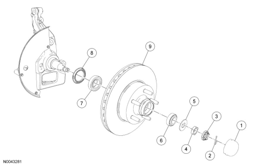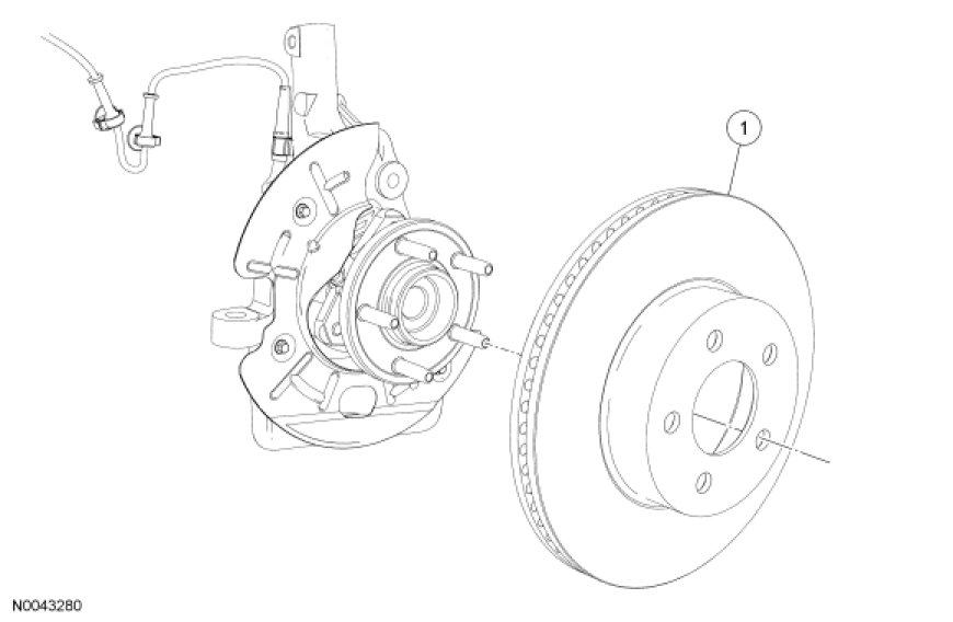 1. Remove the front disc brake caliper anchor plate. For additional information, refer to Brake Caliper Anchor Plate Brake Caliper Anchor Plate.