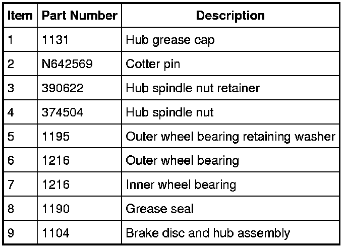 2. Clean the inner and outer wheel bearings, the brake disc and hub race with specified metal brake parts cleaner. Inspect for damage or wear.