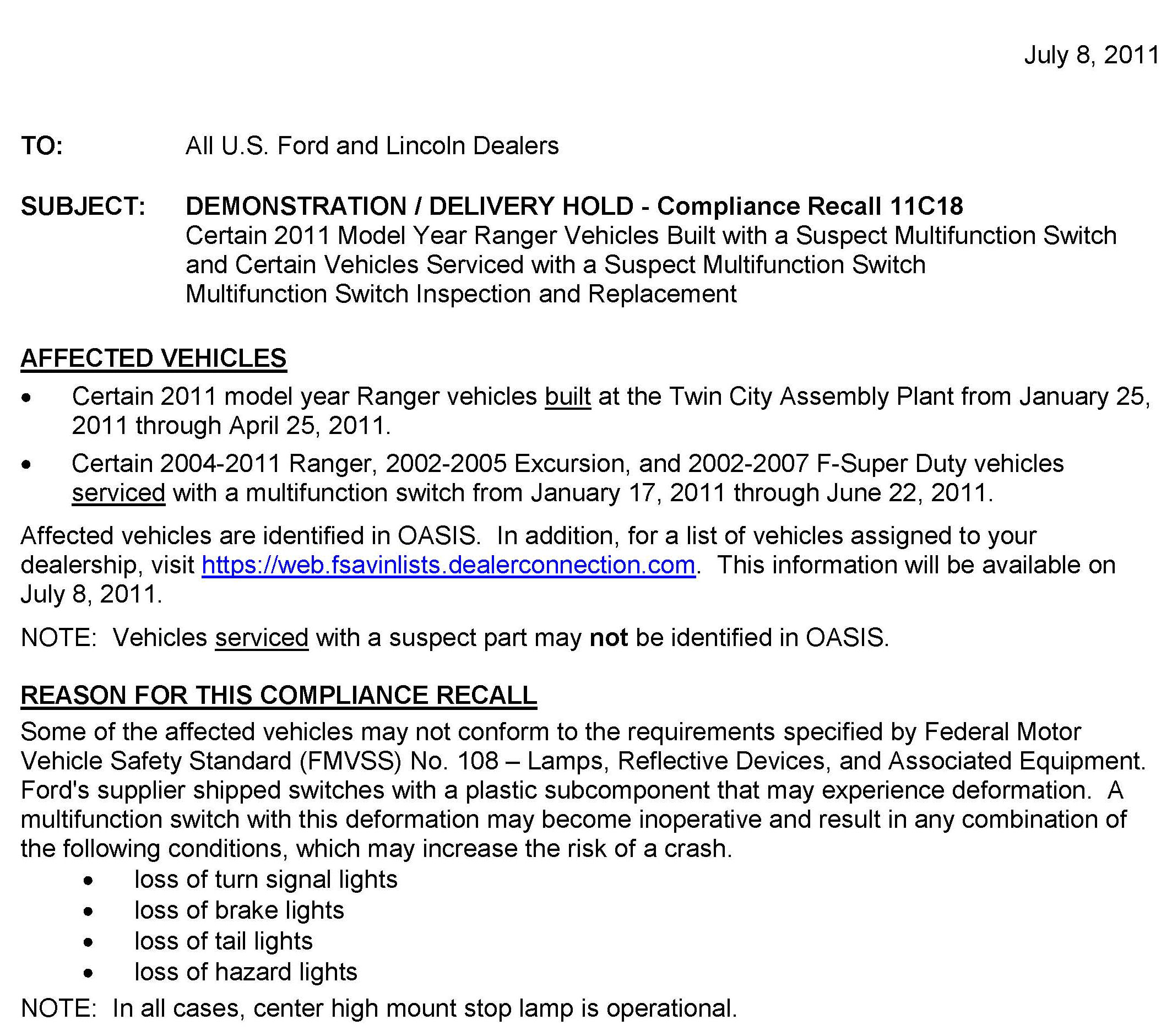 Recall - Multifunction Switch Replacement