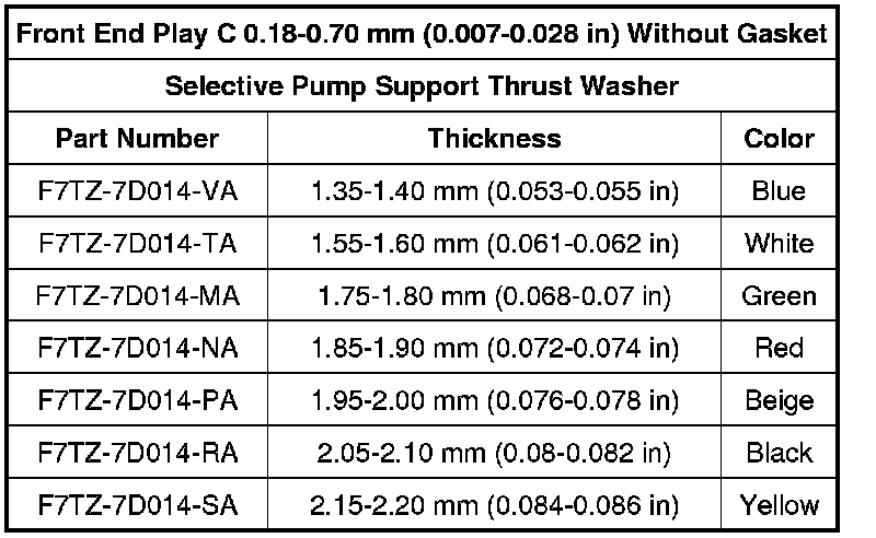 Use dimension C and the chart below to select the correct thickness fluid pump inlet thrust washer (No. 1).