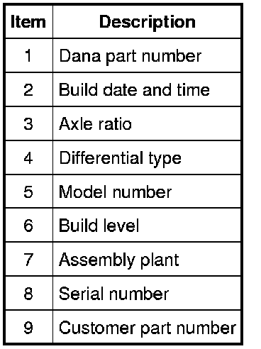 The axle ratio may be verified by checking the printed label on the axle housing. If worn or not visible, the Vehicle Identification Number (VIN) can be typed in the service parts ordering system or the Vehicle Certification (VC) label may be used to correctly identify the axle and ratio. The VC label is located in the driver door jamb. The first 2 digits of the axle code indicate the rear axle and the third digit refers to the front axle, if so equipped. For information on the VC label, refer to Vehicle Identification Codes.
