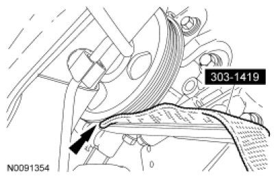 Position the power steering drive belt around the Stretchy Belt Installer Tool and the power steering pump pulley. Make sure the belt is engaged with the power steering pump pulley and rotate the crankshaft clockwise to install the power steering drive belt.