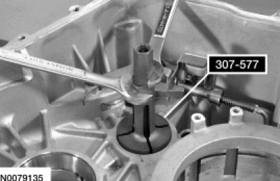 60. If the transaxle case side differential bearing cup is damaged, install the Differential Bearing Cup Remover 307-586 on the bearing cup.