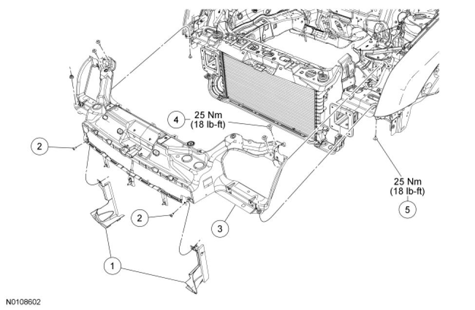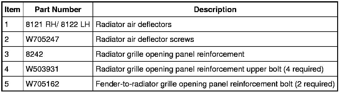 5. Remove the fender-to-radiator grille opening panel reinforcement bolts.