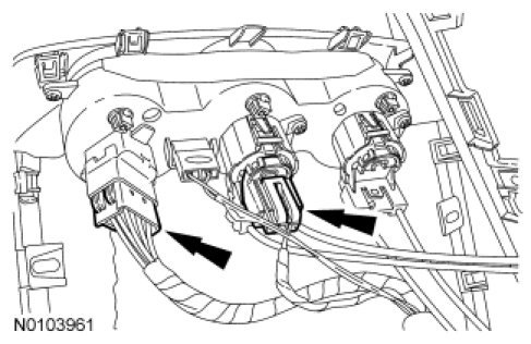 11. Pull the front floor console section toward the rear of the vehicle, releasing the retaining clips from the instrument panel. Disconnect the 2 electrical connectors from the HVAC controller.