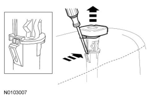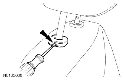 - Insert a suitable tool on the RH side of each head restraint guide sleeve to release the locking tab and pry upward to remove.