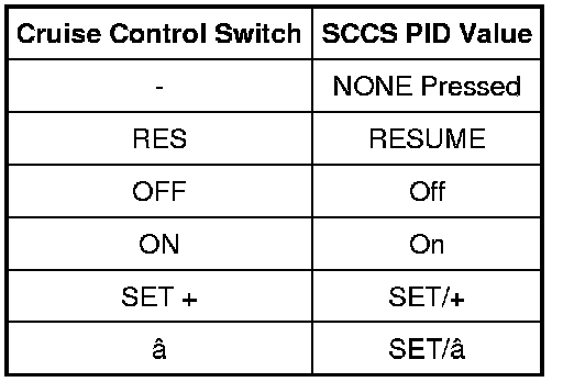 - Press each cruise control switch while monitoring the cruise control switch PID (SCCS).