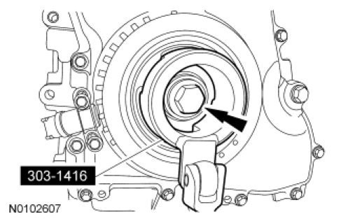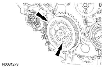 NOTICE: Do not loosen or remove the crankshaft pulley bolt without first installing the special tools as instructed in this procedure. The crankshaft pulley and the crankshaft timing sprocket are not keyed to the crankshaft. The crankshaft, the crankshaft sprocket and the pulley are fitted together by friction, using diamond washers between the flange faces on each part. For that reason, the crankshaft sprocket is also unfastened if the pulley bolt is loosened. Before any repair requiring loosening or removal of the crankshaft pulley bolt, the crankshaft and camshafts must be locked in place by the special service tools, otherwise severe engine damage can occur.