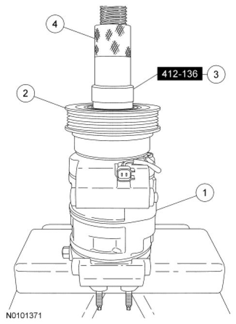 5. NOTE: The A/C compressor must be positioned on the press so that only the flat part of the A/C compressor housing is contacting the base with the A/C compressor shaft aligned with the center of the press shaft. If the A/C compressor is not installed correctly on the press, the A/C compressor and/or A/C compressor pulley will be damaged.