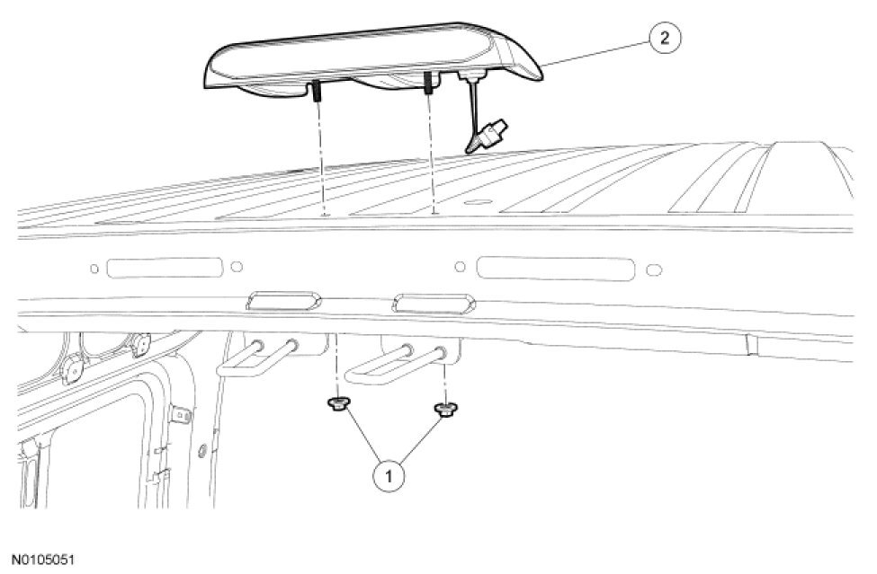 1. If equipped with a rear headliner, remove the pin-type retainers and lower the headliner to access the high mounted stoplamp nuts and electrical connector.