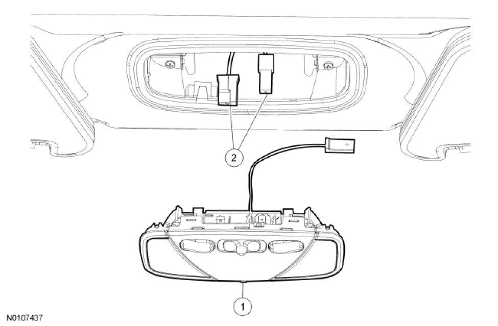 NOTICE: When prying on the front interior lamp, a non-marring tool must be used or damage to the front interior lamp or overhead console can occur.