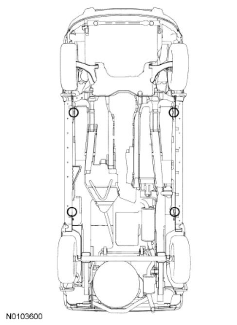 NOTICE: Damage to the suspension, exhaust or steering linkage components may occur if care is not exercised when positioning the hoist adapters prior to lifting the vehicle.