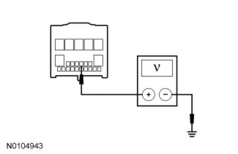 - Measure the voltage between the GEM C201a-10, circuit 15-DK20 (GN/OG), harness side and ground.