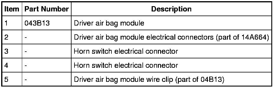 NOTE: Driver air bag module wire clip (item 5) shown installed on steering wheel for clarity.