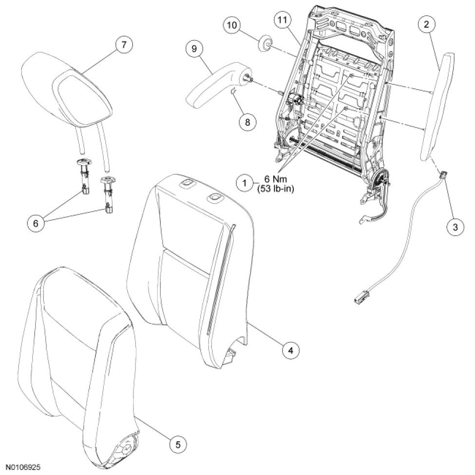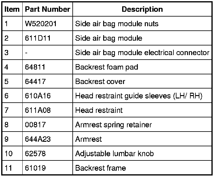NOTE: If a side air bag deployment took place, a new seat backrest pad, trim cover, side air bag module and nuts must be installed. A new backrest frame should be installed if necessary.