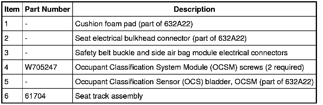 1. WARNING: Install a new occupant classification sensor (OCS) system service kit as a complete assembly. Never install only part of the kit components. Failure to follow this instruction may result in incorrect operation of the OCS system and increases the risk of serious personal injury or death in a crash.