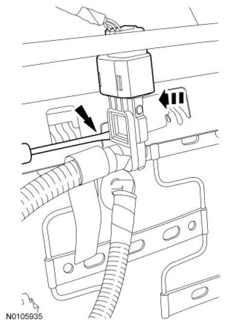 10. Insert a suitable tool to release the locking tabs and remove the brown safety belt buckle electrical connector and yellow side air bag connector from the seat electrical bulkhead connector.