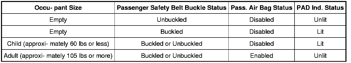 The following table indicates the passenger air bag status and the PAD indicator status based on the size of the front passenger occupant.