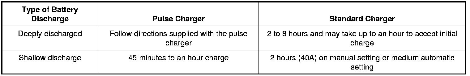 NOTE: Battery chargers have improved greatly with the addition of the new generation pulse chargers. These chargers pulse current into the battery, breaking down the sulfation layer on the battery plates and generally reduce charging times to less than an hour.