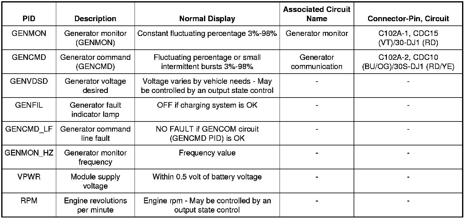 The PIDs and their associated descriptions used in charging system diagnosis are listed in the following table: