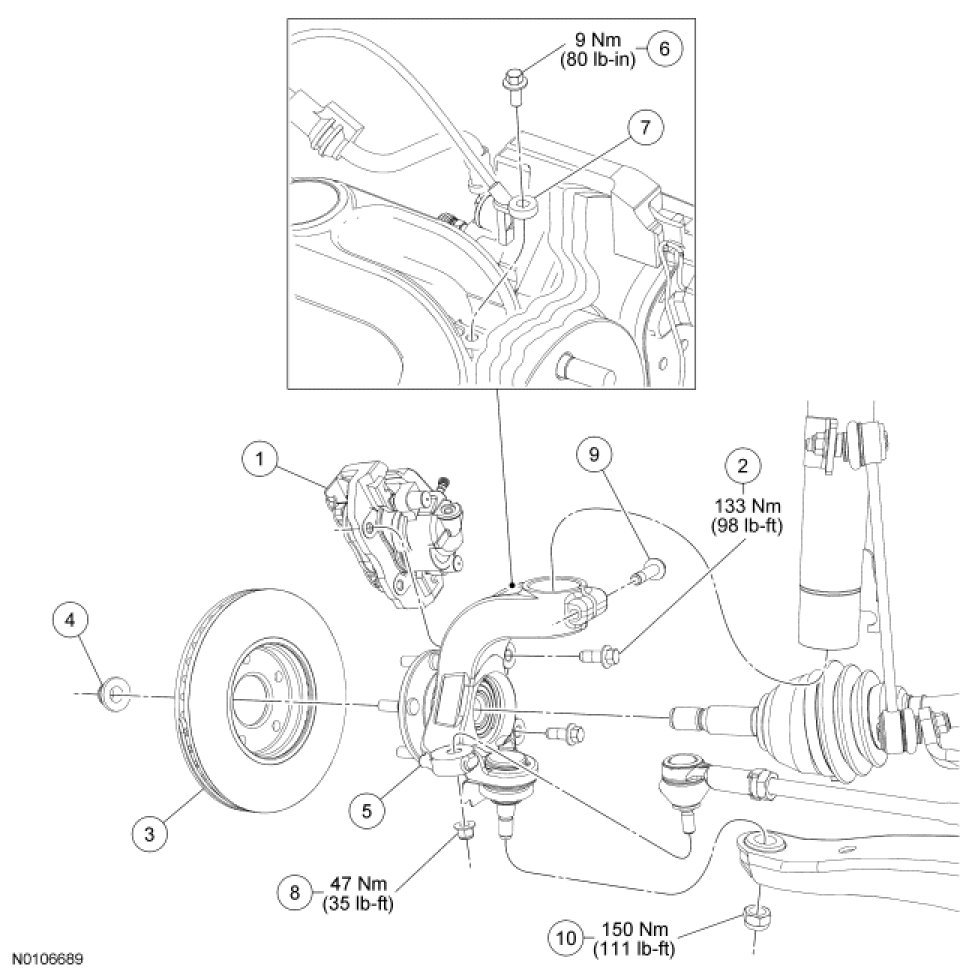 7. Position the caliper and anchor plate assembly and install the 2 bolts.