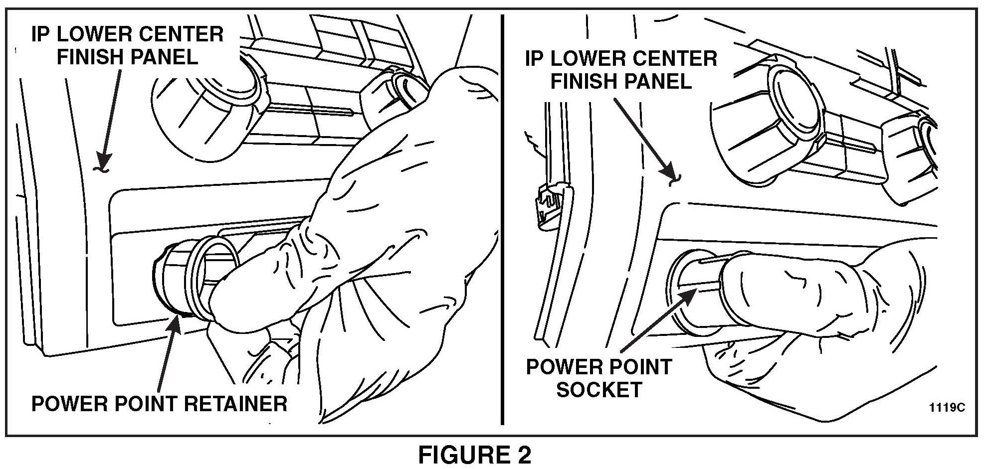 5. Install the new power point retainer onto the new instrument panel lower center finish panel. See Figure 2.