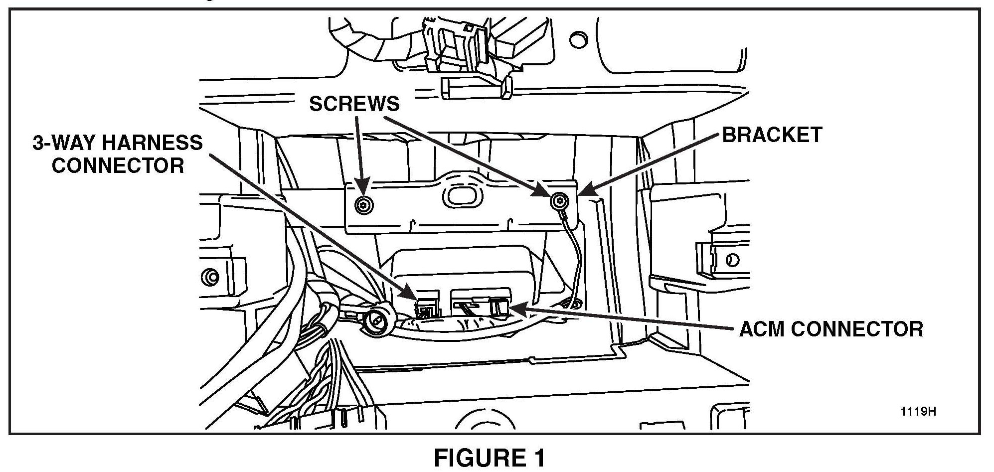 3. Remove the 2 screws and position the bracket to access the 3-way harness connector and the ACM connector. See Figure 1.