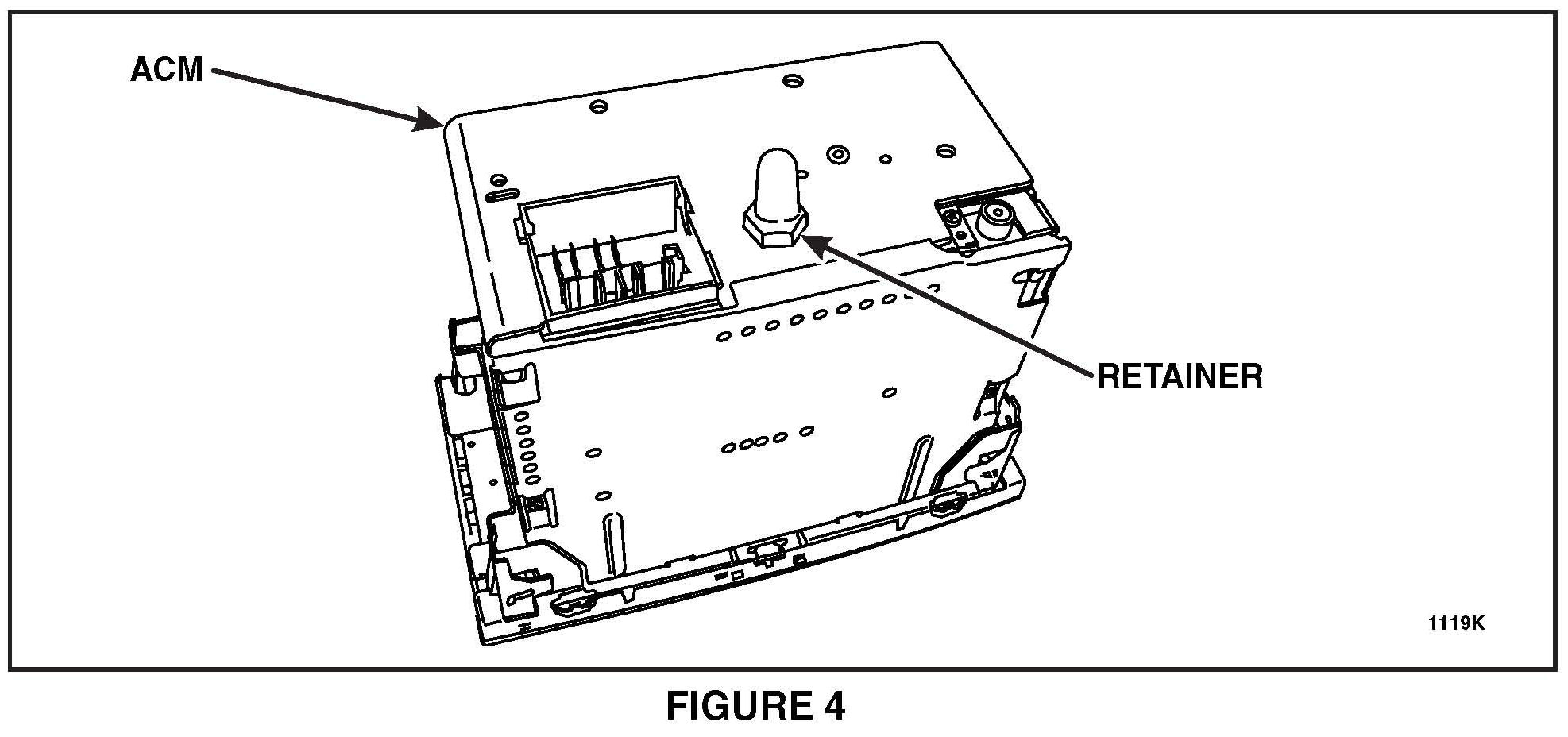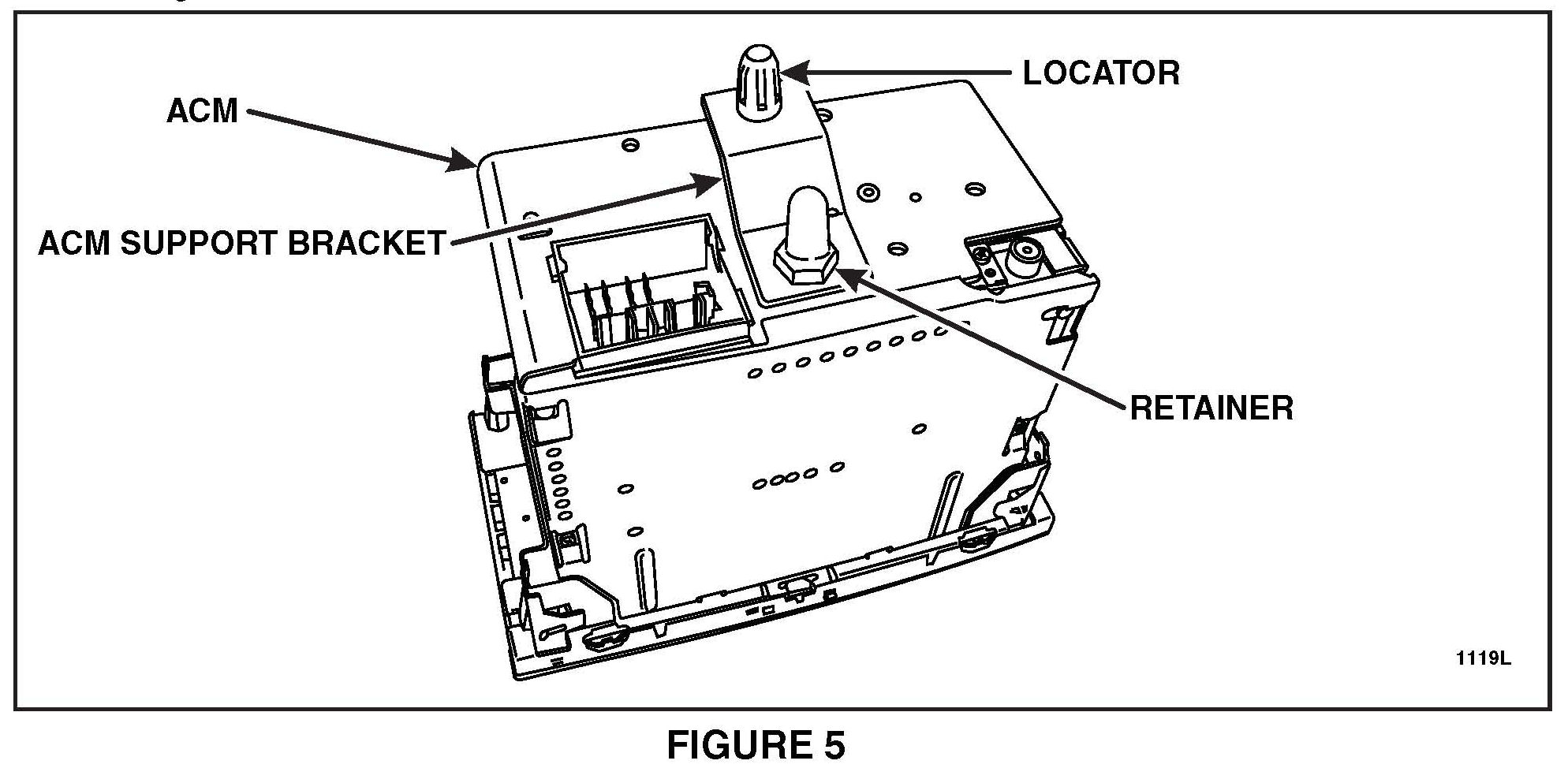 10. Position the new ACM support bracket onto the back of the new ACM. Install the retainer and locator. See Figure 5.