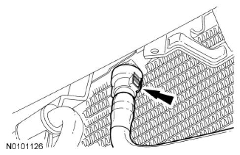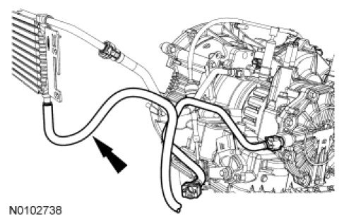 15. Connect the transmission fluid cooler outlet tube to the transmission fluid cooler. For additional information, refer to Transmission Cooler, A/T.
