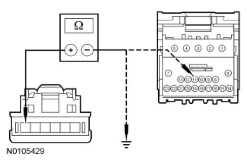 - Measure the resistance between rear window defrost switch C241-6, circuit 31S-HB22 (BK/GN), harness side and ground.