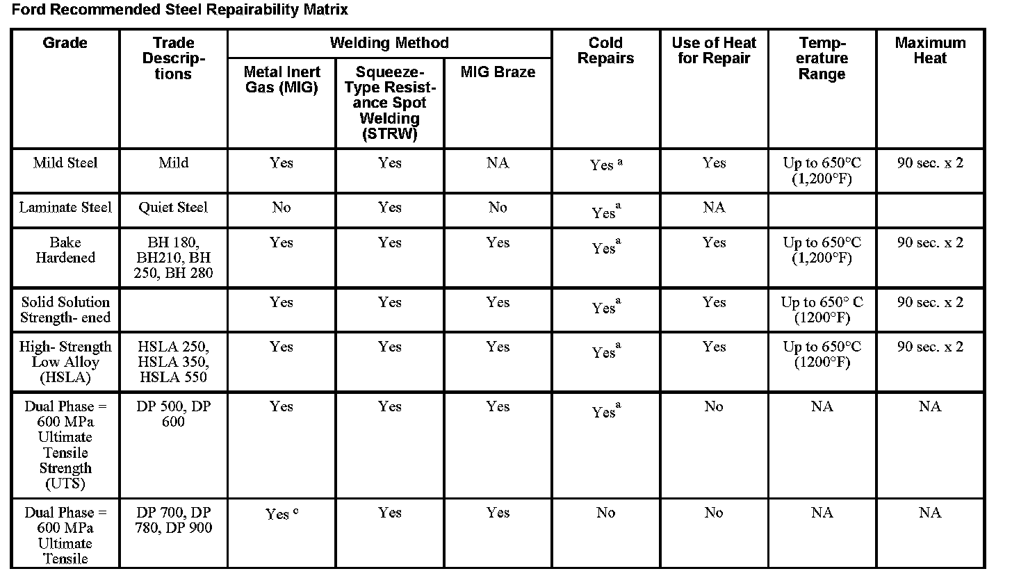Ford Recommended Steel Repairability Matrix (Part 1):