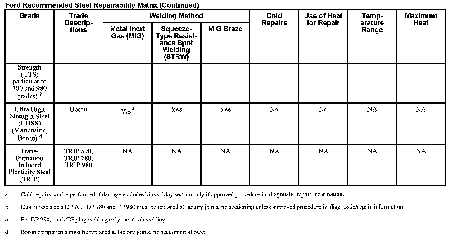 Ford Recommended Steel Repairability Matrix (Part 2):