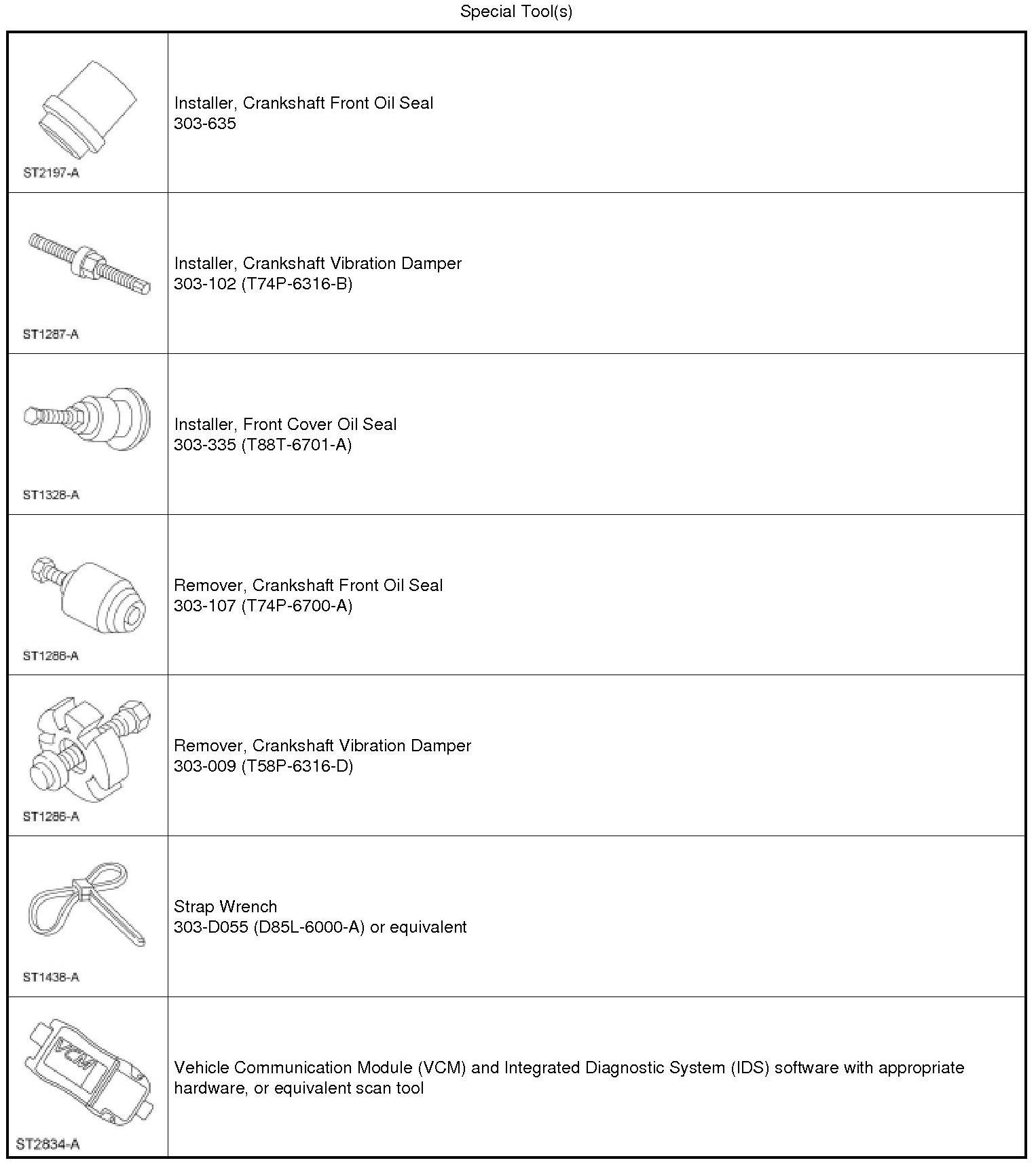 6. Using the Crankshaft Front Oil Seal Installer, the Crankshaft Vibration Damper Installer and the Front Cover Oil Seal Installer, install the new crankshaft front seal into the engine front cover.