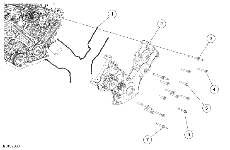 3. Tighten the 15 engine front cover fasteners in the sequence shown to 25 Nm (18 lb-ft).