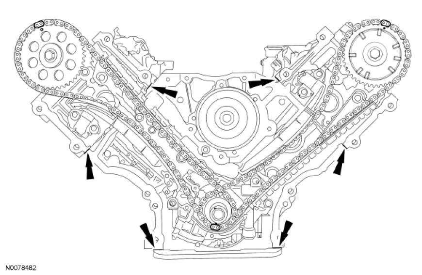 Apply a bead of silicone gasket and sealant along the cylinder head-to-cylinder block surface and the oil pan-to-cylinder block surface, at the locations shown.