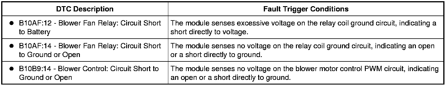 Under normal operation, the relay coil and switch is supplied voltage. When the blower motor relay coil receives a ground from the HVAC module, the relay coil is energized and voltage is delivered to the blower motor and the blower motor speed control from the relay. Ground for the motor is provided from the blower motor speed control. Ground is provided for the blower motor speed control. The HVAC module sends a Pulse Width Modulated (PWM) signal to the blower motor speed control to control the blower speed.