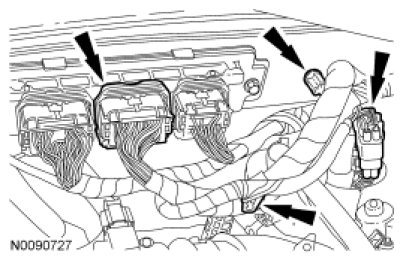 35. Connect the middle PCM electrical connector and the engine wiring harness electrical connector.