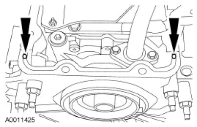 Apply a 10 mm (0.39 in) dot of silicone gasket and sealant to the front cover-to-cylinder block sealing surface.