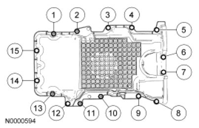 26. Tighten the oil pan bolts in the sequence shown to 25 Nm (18 lb-ft).