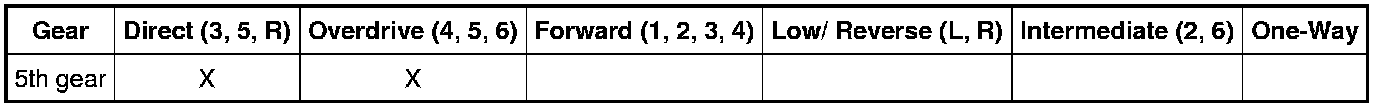 - Regulated line pressure at the clutch control bypass valve in the CBR1/C456 circuit is directed to the O/D (4, 5, 6) clutch through the C456 circuit to apply the clutch.