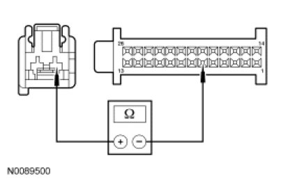 - Measure the resistance between HVAC module - EMTC C2357A-6 or HVAC module - DATC C228A-6, circuit VH406 (VT/BN), harness side and ground.