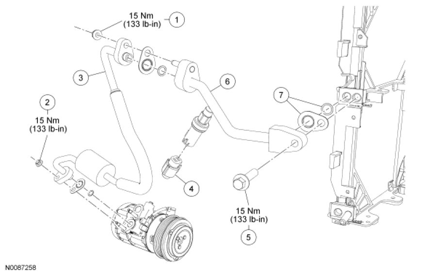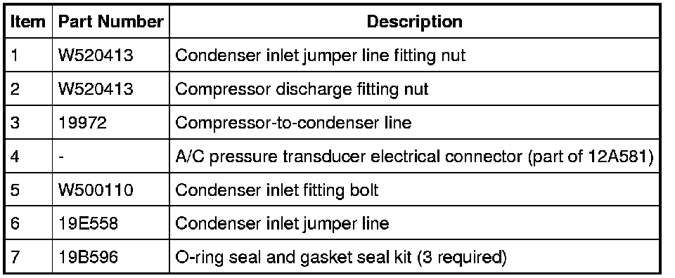 5. If removing the condenser inlet jumper line, remove the RH headlamp assembly. For additional information, refer to Exterior Lighting Service and Repair.