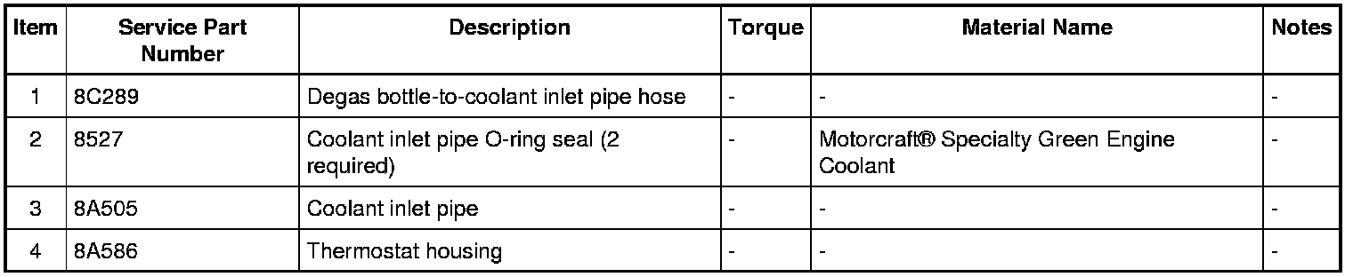 NOTICE: The cooling system is filled with Motorcraft(R) Specialty Green Engine Coolant . Always fill the cooling system with the manufacturer's specified coolant. Chemically flush the cooling system if a non-specified coolant has been used. REFER to Cooling System Flushing. Failure to follow these instructions may damage the engine or cooling system Cooling System Flushing.