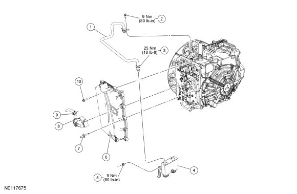 6. Remove and discard the transmission fluid cooler tube bolt and remove the transmission fluid cooler tube.