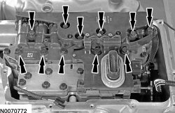 12. Remove the 10 main control valve body bolts and the valve body.