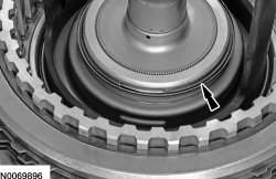 119. NOTICE: Only compress the direct clutch piston return spring far enough to install the direct clutch cylinder snap ring. If the direct clutch cylinder is pressed too far, the direct clutch cylinder alignment tab may be broken off. The tab is used to align the TSS (Turbine Shaft Speed) sensor tone wheel (part of the direct clutch cylinder). If the tab is broken, erratic shifts and transmission damage can occur.