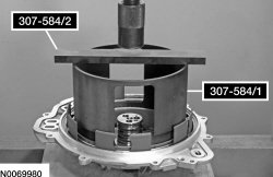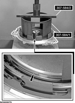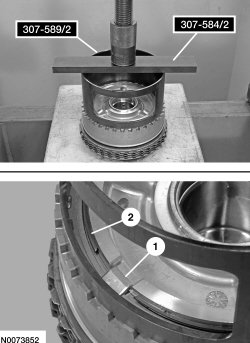 135. Using 307-584/1 and 307-584/2, compress the intermediate clutch return spring, using a press and remove the snap ring.