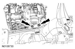 6. Remove the 2 lower transmission support insulator bolts.