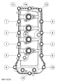 115. NOTE: If the valve cover is not installed and the fasteners tightened within 5 minutes, the sealant must be removed and the sealing area cleaned. To clean the sealing area, use silicone gasket remover and metal surface prep. Failure to follow this procedure can cause future oil leakage.